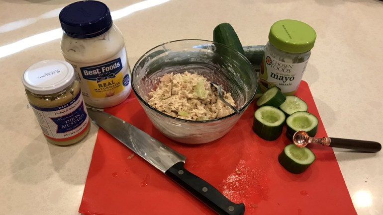 Directions: Cut the cucumber ends off. Then, cut the cucumber into 1 to 2 inch pieces (enough to stuff some tuna into). Use a melon baller or a teaspoon to carve out a hole in the center of the cucumber piece. Keep the scooped out cucumber (optional) and chop into pieces. Combine the tuna, mayo, mustard, salt, pepper, and chopped cucumber scoops. Use a spoon or tablespoon and scoop out some of the tuna mixture, then place it into the cucumber cup. These are perfect snacks or great for lunch. Enjoy and feel better if you’re under-the-weather!
