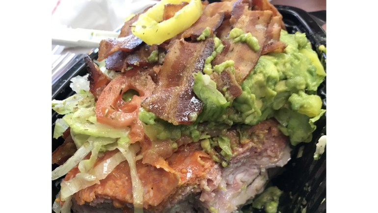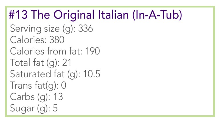 We knew ahead of time that Paella, that yummy Spanish dish with lots of rice, seafood, and other protein, would be served during the reception. So, after the wedding ceremony at the church, we took the two hour break to change into more comfy clothes, and stopped to get the #13 Original Italian Sub-in-a-Tub at Jersey Mikes! Lots of yummy, fatty deli meat, cheese, mike’s way with banana peppers and oregano seasoning, tomato, lettuce, onion. I added bacon and avocado to mine. (TIP: ask for a GIANT sub, in one tub.) Mark ordered the Cheesesteak, a hot sub, in a tub. His was topped with lettuce so it wouldn’t get soggy and he added jalapeños. YUM! Below is an overview of the nutrition facts for the Original Italian Sub In A Tub. (*NOTE: these facts do not include the added bacon and avocado). You can take a look at all of the nutrition facts for items on the Jersey Mikes menu here.